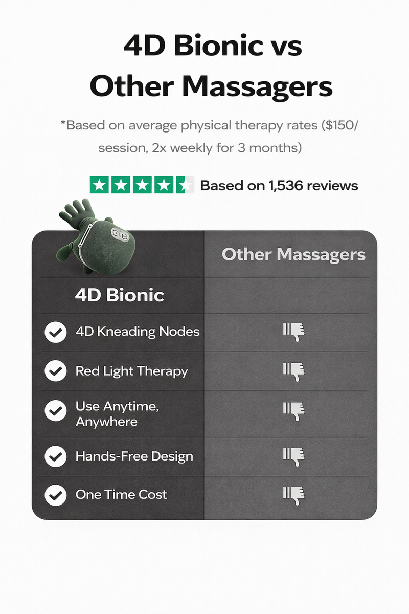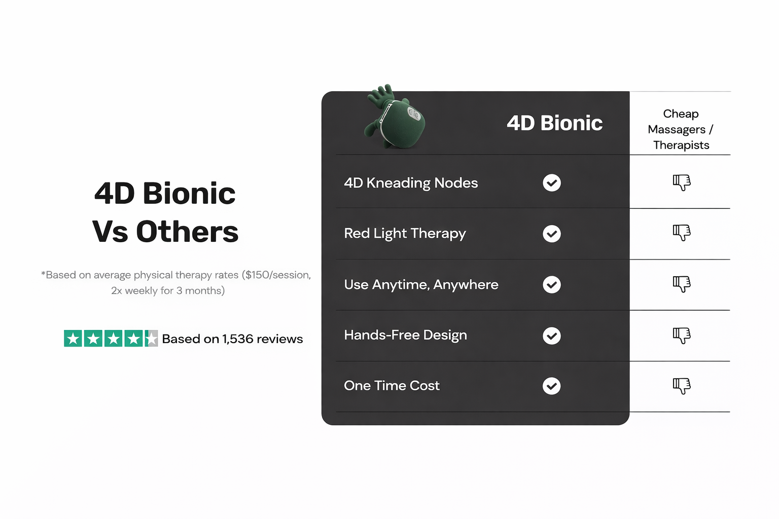 4D Bionic is the only neck massager with bionic finger nodes that grip and knead like a therapist's hands. With built-in heat and red light therapy to release tight muscles faster. Perfect for desk workers, chronic tension, and stress-induced stiffness.