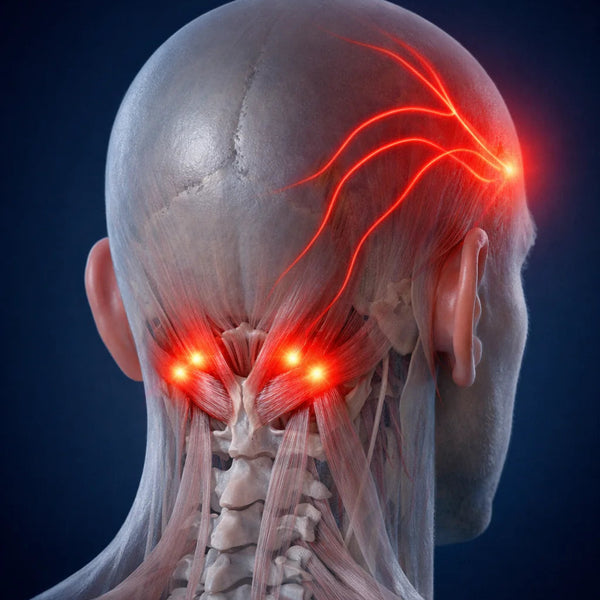 The suboccipital muscles at the base of your skull are particularly problematic. When these muscles tighten, they can refer pain directly into your temples, behind your eyes, and across your forehead.